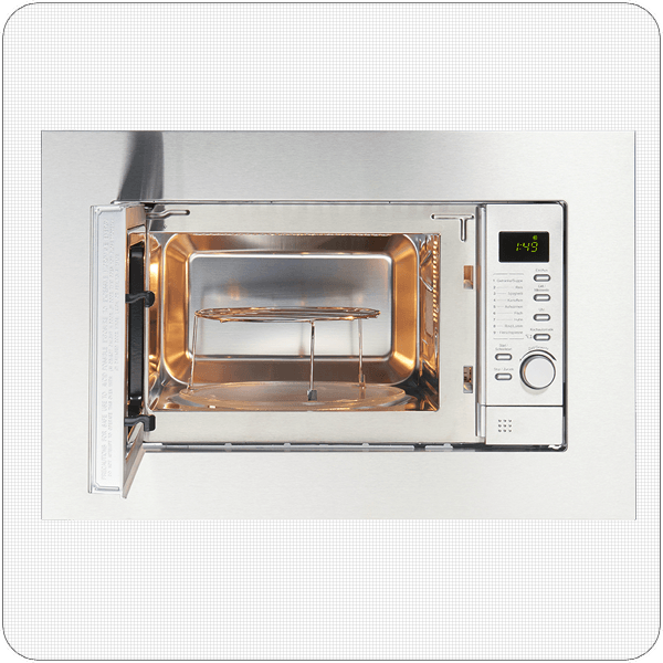 Edelstahl gebürstet, Garraum Edelstahl, 20 Liter Volumen, 800 Watt Maximale Leistung, 6 Leistungsstufen, Auftaufunktion, Endsignal, Druckknopf, Drehteller