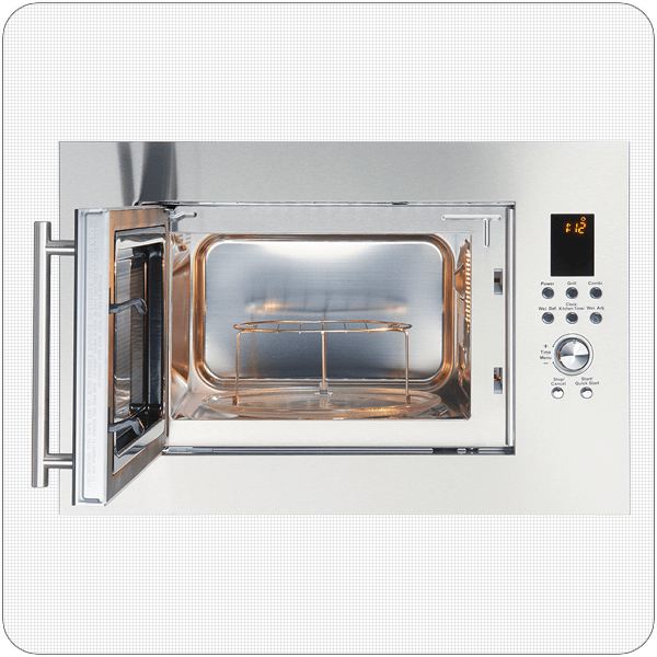 Edelstahl gebürstet, Garraum Edelstahl, 23 Liter Volumen, 900 Watt Maximale Leistung, 6 Leistungsstufen, Auftaufunktion, Endsignal, Edelstahlgriff, Drehteller