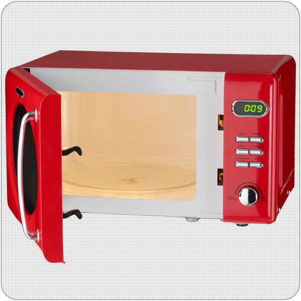 Kunststoff rot lackiert, Garraum Weiß lackiert, 20 Liter Volumen, 700 Watt Maximale Leistung, 5 Leistungsstufen, Auftaufunktion, Endsignal, Griff, Drehteller 24,50 cm